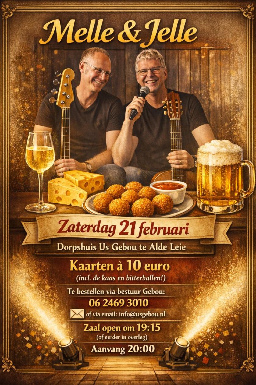 Zaterdag 21 februari, dorpshuis Us Gebou te Alde Leie. Kaarten a 10 euro (incl. de kaas en bitterballen!)